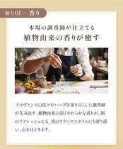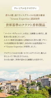 世界が認めたグラースの伝統的製法や専門知識を尊重し継承している製品であり、調香、抽出、ブレンドなどの工程が、工房の職人によって丁寧に行われている証です。香りの中に南仏の自然と文化、そして職人の情熱と息づかいが溶け込んだ特別な石けんです。