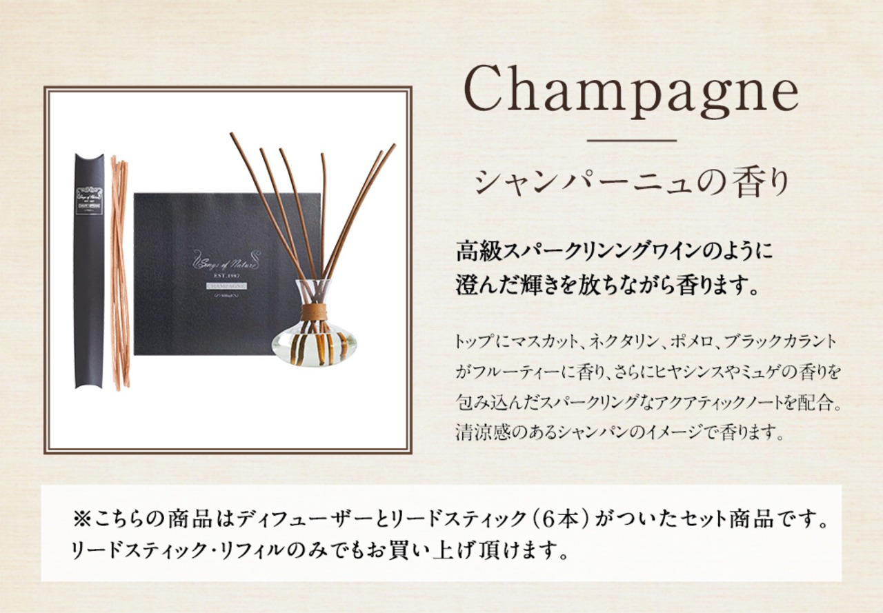 『トップに配したマスカット、ネクタリン、ポメロ、ブラックカラントのフルーティーなブレンドをさらにヒヤシンスやミュゲの香りを包み込んだスパークリングなアクアティックノートと配合し、清涼感溢れるシャンパンイメージの香りです。』
