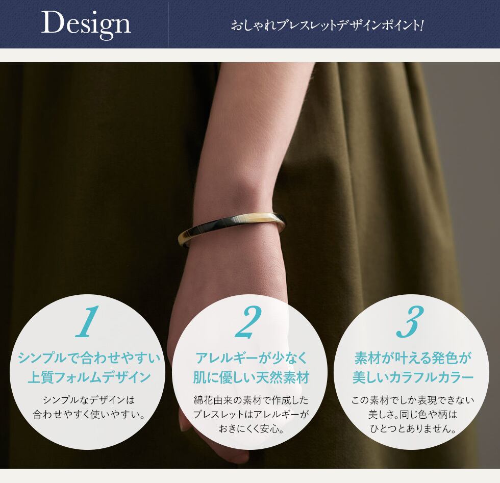 サイズフリーなので腕が細い人、太い人、メンズにもおすすめです。 天然素材由来の色柄豊富な素材なので、何個も連ねて手元を華やかに演出できます。